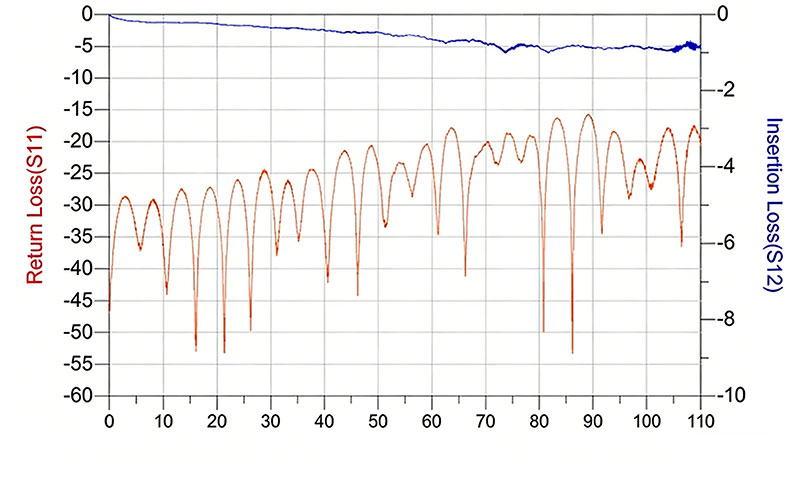 基于 GSG 150μm 间距,DC~110 GHz 时 < 1.3 dB |