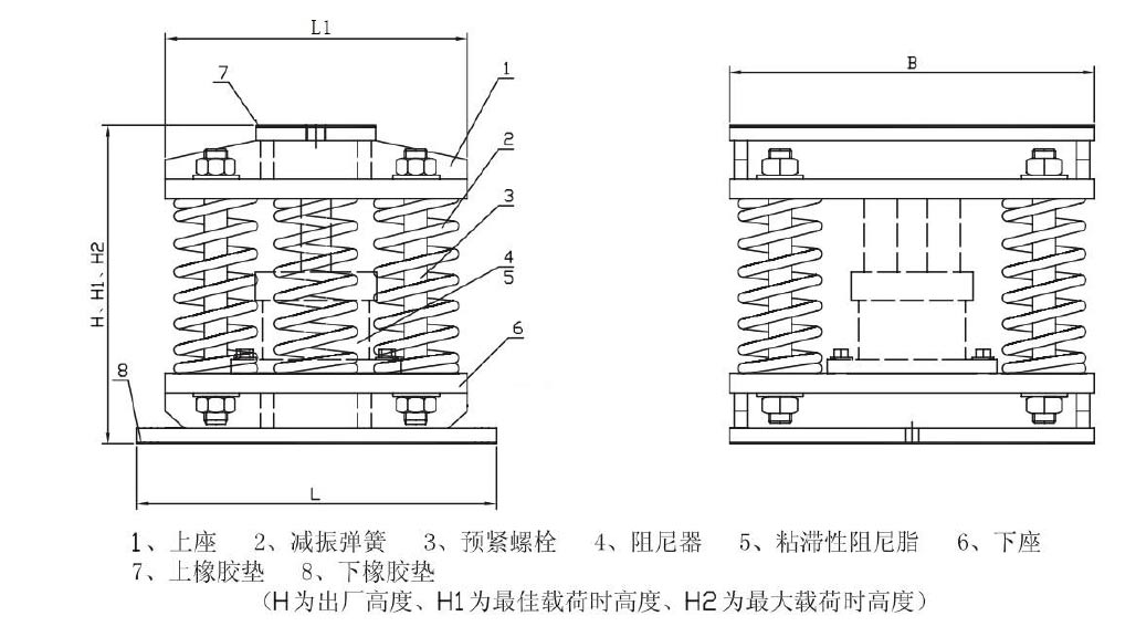 3、MSZN型弹簧阻尼减振器维修更换方便,可在隔振器上部二端与隔振台之间置放千斤顶,压缩隔振器,固有高度后抽出隔振器,不需将整台大型设备全部起重方可更换,也可压缩隔振器后上部插入垫物来调节水平。
